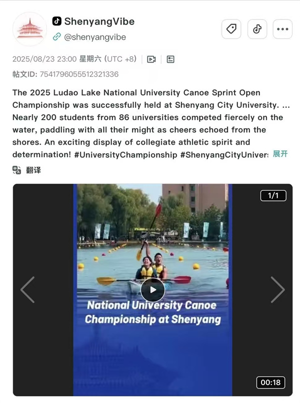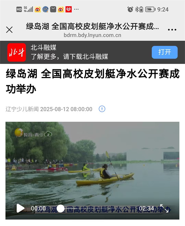 2025年8月9日,在我国第17个“全民健身日”到来之际,由沈阳城市学院、全国高校皮划艇联盟主办的第二届绿岛湖全国高校皮划艇静水公开赛在沈阳绿岛湖燃情开赛。本次比赛吸引了来自清华大学、北京大学、中山大学、厦门大学、大连理工大学、重庆大学、东北大学等86所高校的200余名学生参赛。此次比赛得到了中国日报抖音海外版、辽宁卫视、辽宁日报等5家权威媒体的关注。