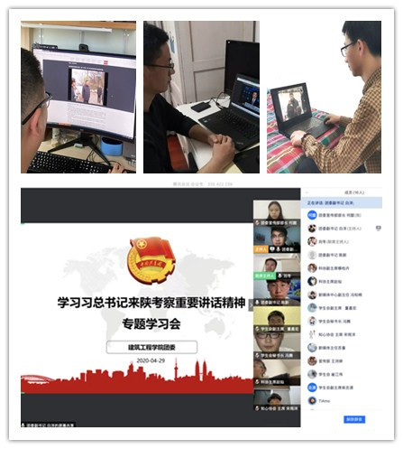 4月29日晚,学院组织全体学生党员和学生干部通过视频会议网络集中学习习近平总书记来陕考察重要讲话精神。4月30日至5月30日学院13个师生党支部、34个团支部陆续以自学+线上讨论交流的形式,通过网络媒体、学习会、研讨会、网络视频会等方式进行学习并展开了热议。