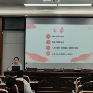 党课开班仪式结束后,董元浩老师为大家讲授了第一次党课,他以“入党有要求,标准需严守”为题,从申请入党的条件、党员的基本条件、入党积极分子的确定、教育和考察、大学生入党流程及注意事项等四个方面详细讲解。使大家对成为党员需要具备的条件和入党流程有了更进一步的了解和认识。