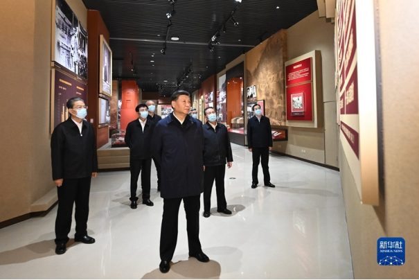 10月27日,中共中央总书记、国家主席、中央军委主席习近平带领中共中央政治局常委李强、赵乐际、王沪宁、蔡奇、丁薛祥、李希,瞻仰延安革命纪念地。这是习近平等在延安革命纪念馆,参观《伟大历程——中共中央在延安十三年历史陈列》。 新华社记者 燕雁 摄