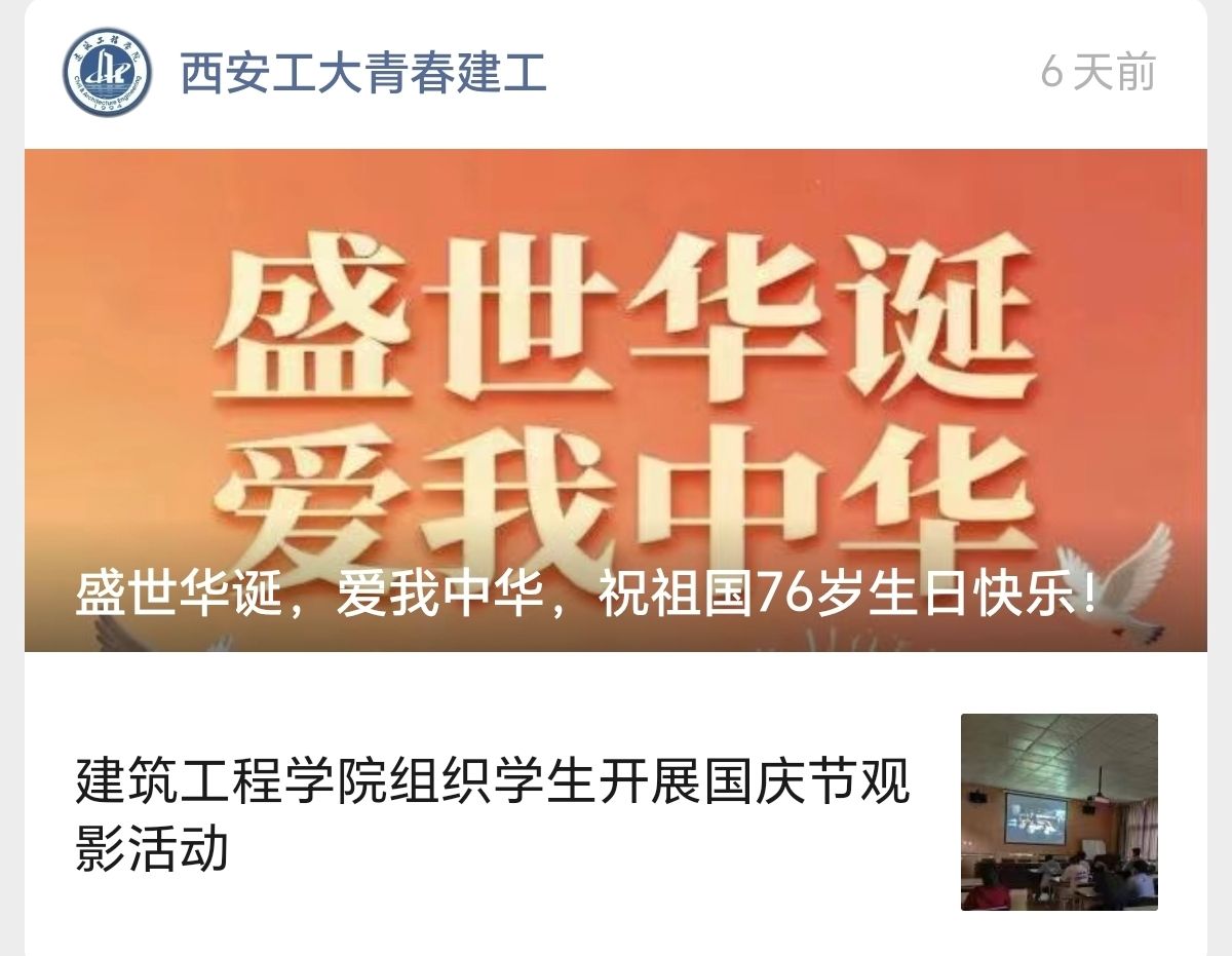 为庆祝中华人民共和国成立76周年,营造浓厚的爱国氛围,建筑工程学院于国庆期间依托“西安工大青春建工”微信公众号,正式推出“华诞传祝福”线上专题活动,汇聚全院师生对祖国的美好祝愿。