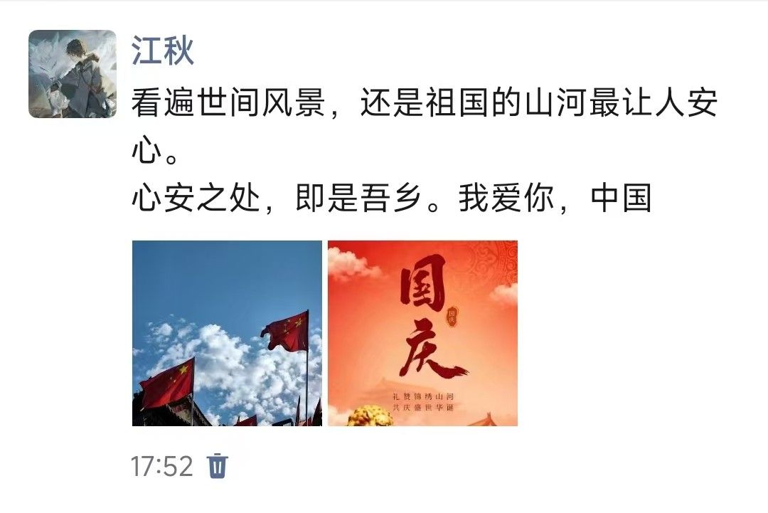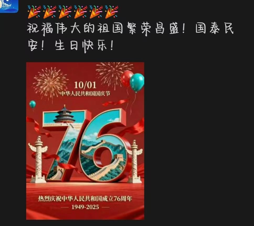 活动期间,同学们充分发挥创意,在微信朋友圈等平台以多元形式表达祝福:既有记录家乡街头鲜艳国旗与节日盛景的影像,也有展现校园特色国庆布置的瞬间;既有反映城市建设新貌的对比组图,也有记录家庭生活变迁的温情画面。这些生动鲜活的内容,配以“愿山河锦绣,国富民强”的美好祝愿和“以青春之我,建设青春之中国”的铮铮誓言,在网络上形成了一道亮丽的祝福风景线。