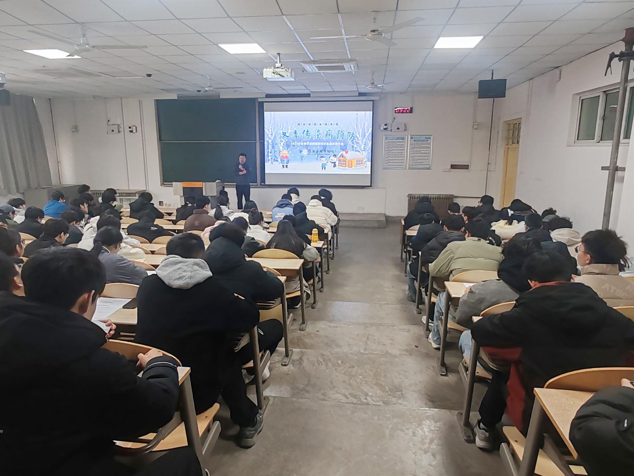 首先,会议聚焦冬季传染病预防,通过专题展示向同学们普及冬季常见传染病的传播途径、症状表现及科学预防措施,提醒大家注重个人卫生、做好防寒保暖,降低感染风险,一旦患病需及时反馈并就医。