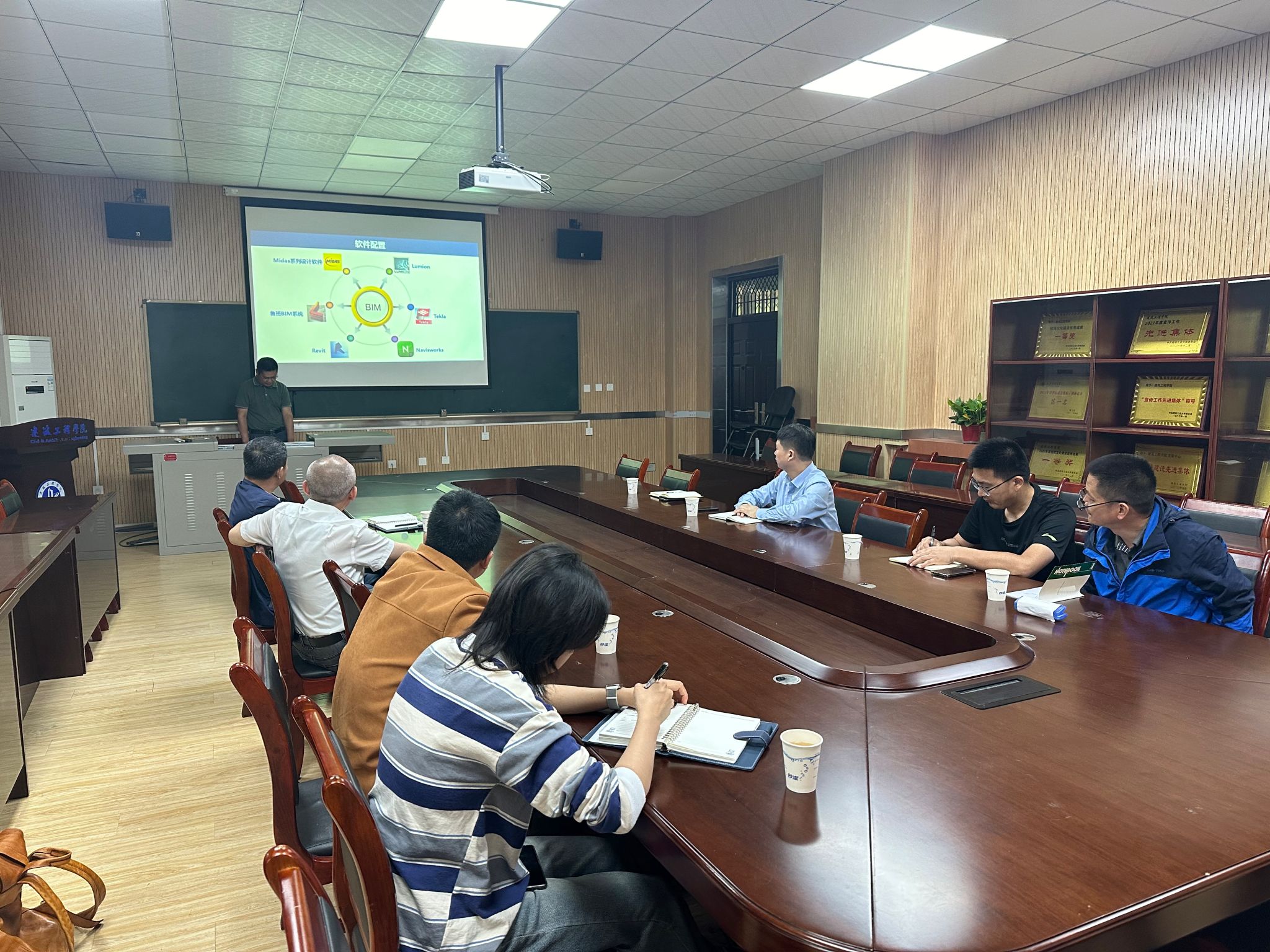 学院院长黄华介绍了学院团队的科研特色和研究成果,智能建造系主任李养成介绍了学院BIM平台以及相关的科研和学生培养。