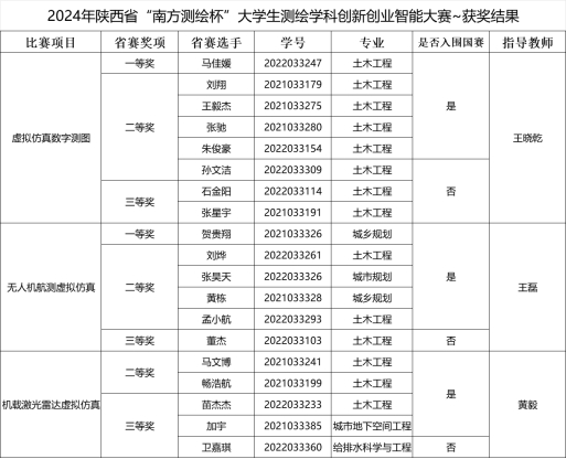 西安工业大学建筑工程学院的24名选手由王晓乾、王磊、黄毅三位老师指导参赛,代表队在虚拟仿真数字测图、无人机航测虚拟仿真和机载激光雷达虚拟仿真三个赛项上成绩斐然。马佳媛和贺贵翔同学分别荣获虚拟仿真数字测图比赛和无人机航测虚拟仿真比赛的一等奖,其它同学荣获11个二等奖和6个三等奖;选手获奖比例79.2%。王晓乾和王磊老师荣获省赛优秀指导教师奖。