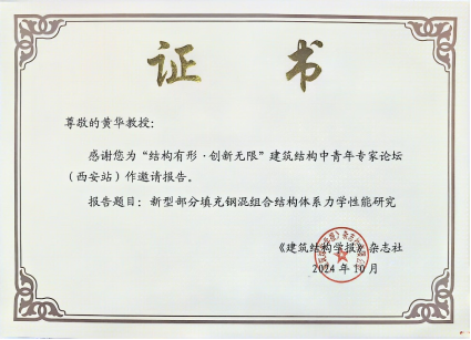 我院数十位教师和研究生参加了本次论坛。其中黄华教授担任分会场主席,并作题为“新型部分填充钢混组合结构体系力学性能研究”的邀请报告;青年教师张高望博士和郭梦雪博士分别作了题为 “面向大尺寸道面的橡胶水泥混凝土早龄期行为研究”、“基于人工智能的基础设施检测与评估”的报告。