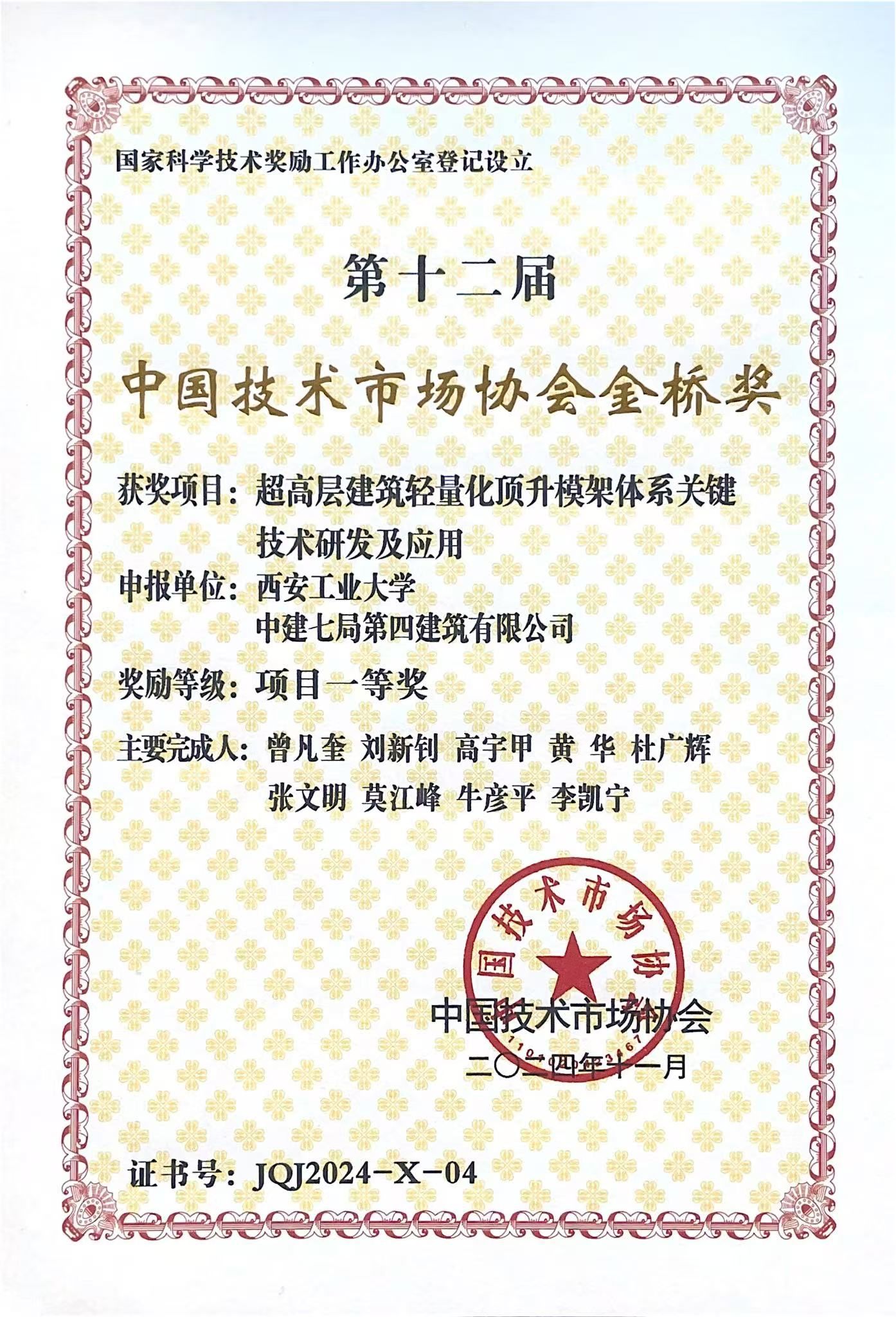 12月14日,第十二届中国技术市场协会金桥奖表彰奖励大会在北京举行。我院曾凡奎、黄华教授以及博士研究生刘新钊共同申报的《超高层建筑轻量化顶升模架体系关键技术研发及应用》项目经过数月的严格评审,在全国各行业近千个优秀项目中脱颖而出,荣膺最高奖项一等奖。