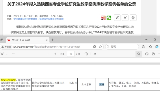 近日,陕西省教育厅公布了第三批陕西省课程思政精品课程和教学团队认定结果,陕西省教育厅、省学位委员会公示了陕西省专业学位研究生教学案例库教学案例名单,我院黄华教授负责的《建筑结构抗震》课程被认定为省级课程思政精品课程,王睿副教授等联合陕西省交通规划设计研究院有限公司、陕西省交通控股集团有限公司、陕西路桥集团等单位申报的《软岩大变形隧道施工关键技术——以银白高速谢家坡隧道为例》入选2024年陕西省专业学位研究生教学案例库教学案例名单。