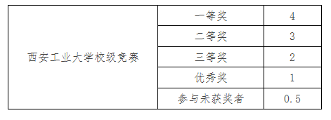 本次大赛设一等奖1名,二等奖2名,三等奖3名,优秀奖5名,获奖者颁发获奖证书及奖品,另依据西安工业大学文件[(2015)008]《关于印发西安工业大学大学生本科学生创新与技能学分认定实施细则(试行)的通知》,计算相应学生技能分,具体如下: