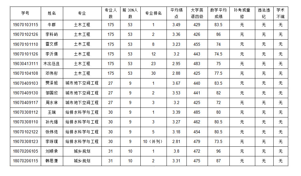 按照《关于做好西安工业大学2023年推荐优秀应届本科毕业生免试攻读研究生工作的通知》《西安工业大学建筑工程学院推荐免试攻读硕士研究生实施细则》工作要求,现将符合推免基本条件的2023届本科毕业生名单公示如下: