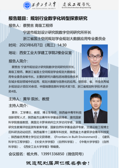 为了适应日益增长的城乡规划编制、管理内容的复杂性和科学性,更好地满足现代社会对于城乡规划行业的需求,促进城乡规划专业的高质量发展。西安工业大学建筑工程学院将于2023年6月7日举办题为《规划行业数字化转型探索研究》的主题报告,本次报告邀请到宁波市规划设计研究院数字空间研究所所长,浙江省国土空间规划学会规划大数据应用专业委员会蔡赞吉高级工程师主讲,重点探讨在规划行业如何运用人工智能、大数据等技术方法,实现城乡规划高质量发展、国土空间规划一张蓝图建设等相关内容。诚邀校内外相关领域的专家、学者莅临指导。会议具体安排如下: