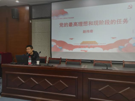 赵老师以“党的最高理想和现阶段的任务”为题讲授本次课程。通过党的纲领,引出党的最高理想和最终目标是实现共产主义,指出共产主义社会是人类历史最美好的社会制度,社会主义必将代替资本主义,最后必然发展为共产主义;他还讲到,党的现阶段的基本任务是建设中国特色社会主义,社会主义初级阶段是不可逾越的历史阶段。