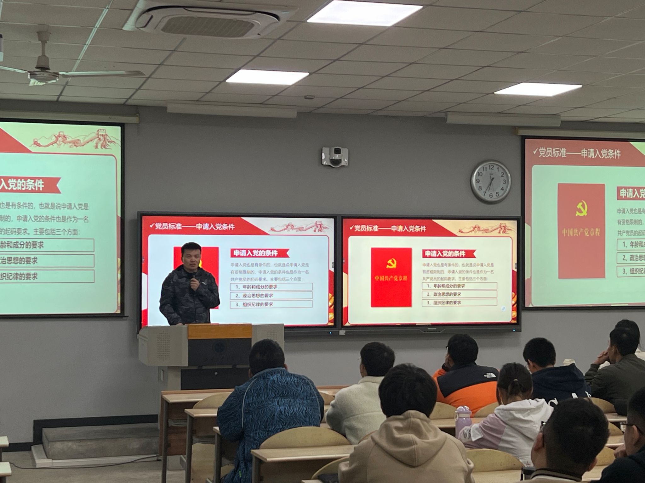 刘老师从申请入党的条件,党员的基本条件,入党积极分子的确定、教育和考察以及大学生入党流程及注意事项等四个方面进行详细讲解,首先刘老师讲解了大学生入党的基本要求。作为入党积极分子,大家应当全心全意为人民服务,不谋求任何私利和特权;接着对由入党积极分子成为正式党员的规范程序进行了讲解;最后,重点强调了大学生要端正入党动机,认真学习党的理论知识,自觉接受党组织的培养、教育和考察,以实际行动争做新时代合格的大学生党员。