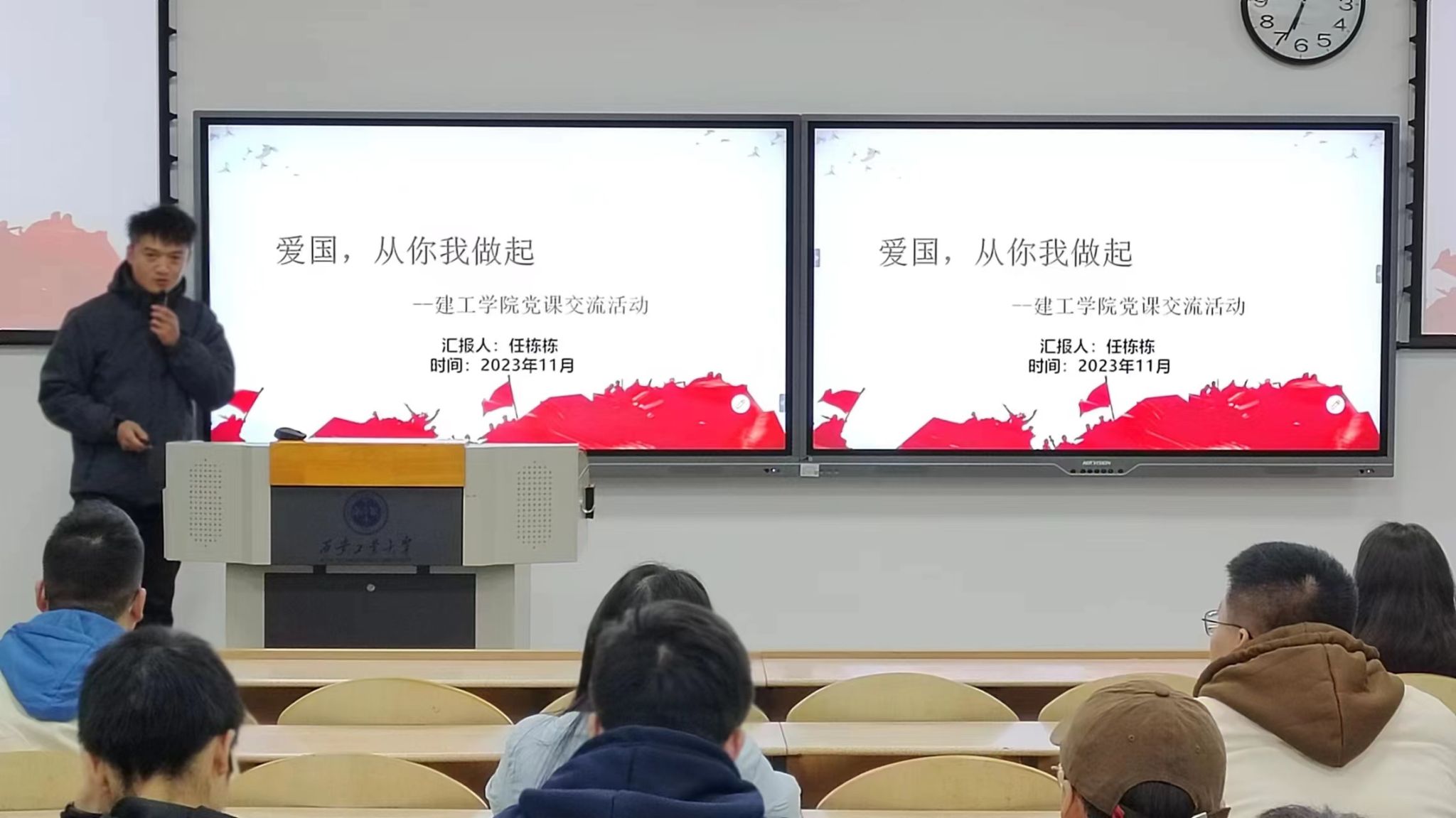 为进一步弘扬爱国主义精神,厚植爱国主义情怀,将爱国主义教育贯穿于党员发展教育全过程,11月23日,建筑工程学院分党校第67期积极分子培训班在教2-106举办第67期入党积分子党课培训班爱国主义交流活动,本次交流活动邀请机电工程学院退役大学生任栋栋进行作交流汇报,活动由学院党委组织员董元浩主持。